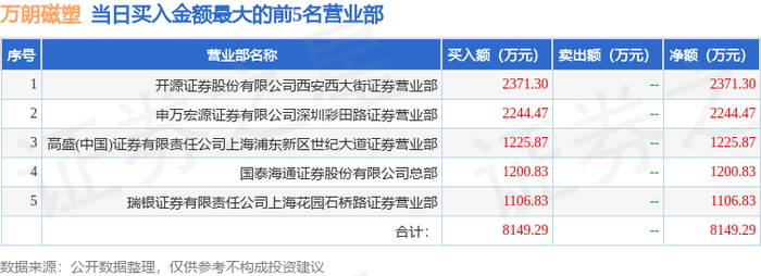 证券之星消息,沪深交易所2025年10月27日公布的交易公开信息显示,万朗磁塑(603150)因有价格涨跌幅限制的日收盘价格涨幅偏离值达到7%的前五只证券登上龙虎榜。此次是近5个交易日内第1次上榜。