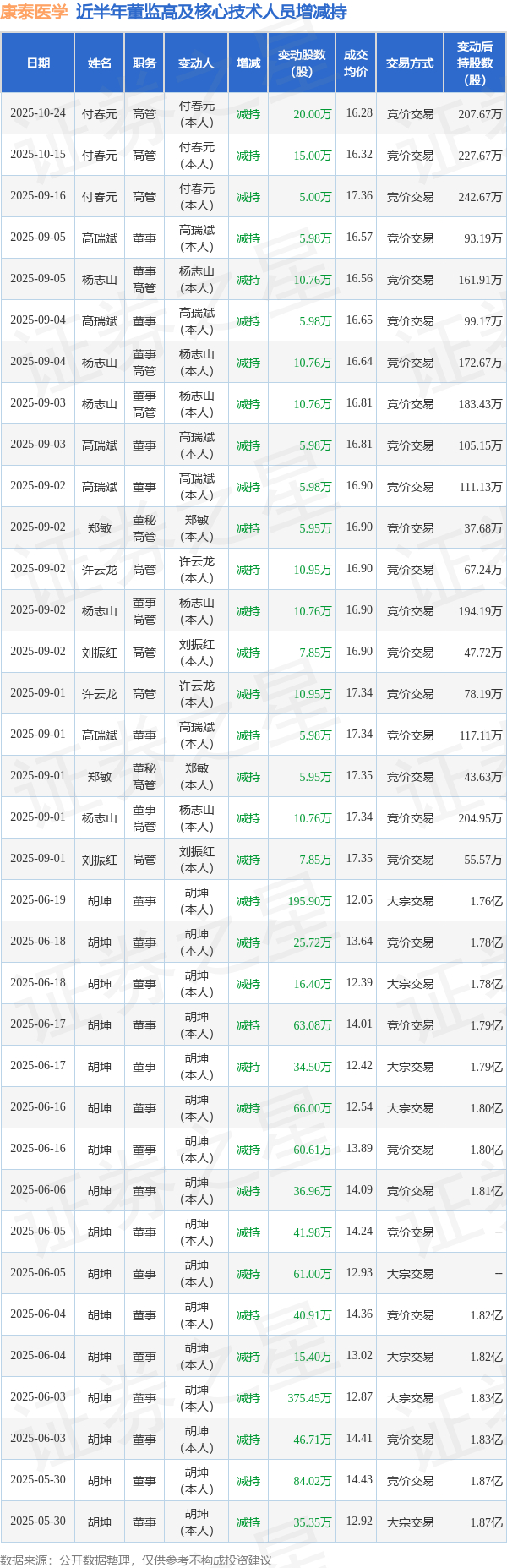 康泰医学近半年内的董监高及核心技术人员增减持详情如下: