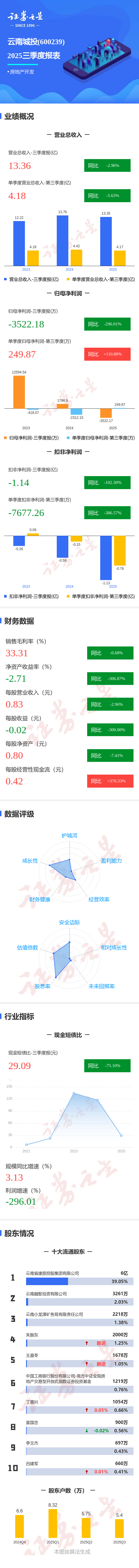 证券之星消息,云南城投2025年三季报显示,公司主营收入13.36亿元,同比下降2.97%;归母净利润-3522.18万元,同比下降296.01%;扣非净利润-1.14亿元,同比下降102.3%;其中2025年第三季度,公司单季度主营收入4.18亿元,同比下降5.64%;单季度归母净利润249.87万元,同比上升110.81%;单季度扣非净利润-7677.26万元,同比下降386.57%;负债率80.34%,投资收益803.36万元,财务费用1.81亿元,毛利率33.31%。