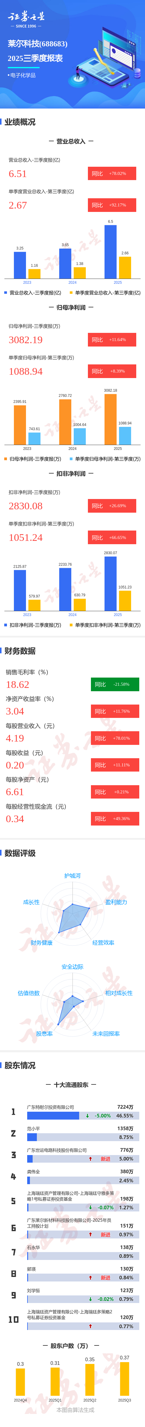 证券之星消息,莱尔科技2025年三季报显示,公司主营收入6.51亿元,同比上升78.02%;归母净利润3082.19万元,同比上升11.64%;扣非净利润2830.08万元,同比上升26.7%;其中2025年第三季度,公司单季度主营收入2.67亿元,同比上升92.17%;单季度归母净利润1088.94万元,同比上升8.39%;单季度扣非净利润1051.24万元,同比上升66.65%;负债率36.41%,投资收益0.38万元,财务费用-8.54万元,毛利率18.62%。