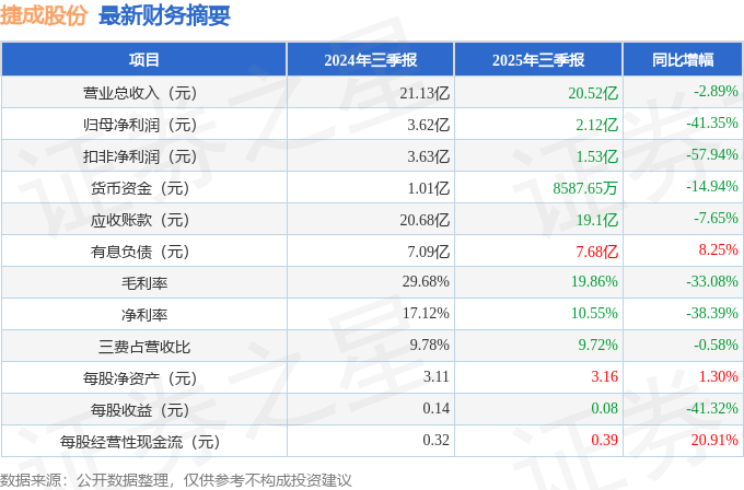 据证券之星公开数据整理,近期捷成股份(300182)发布2025年三季报。截至本报告期末,公司营业总收入20.52亿元,同比下降2.89%,归母净利润2.12亿元,同比下降41.35%。按单季度数据看,第三季度营业总收入6.85亿元,同比上升3.48%,第三季度归母净利润6693.55万元,同比下降40.27%。本报告期捷成股份公司应收账款体量较大,当期应收账款占最新年报归母净利润比达801.25%。