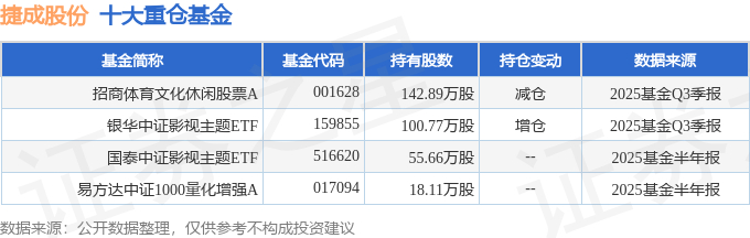 持有捷成股份最多的基金为招商体育文化休闲股票A,目前规模为2.16亿元,最新净值1.864(10月27日),较上一交易日下跌0.37%,近一年上涨28.24%。该基金现任基金经理为文仲阳。