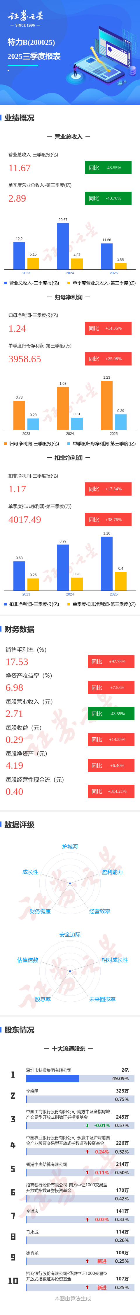 证券之星消息,特力B2025年三季报显示,公司主营收入11.67亿元,同比下降43.56%;归母净利润1.24亿元,同比上升14.36%;扣非净利润1.17亿元,同比上升17.35%;其中2025年第三季度,公司单季度主营收入2.89亿元,同比下降40.78%;单季度归母净利润3958.65万元,同比上升25.98%;单季度扣非净利润4017.49万元,同比上升38.77%;负债率25.57%,投资收益1440.98万元,财务费用337.87万元,毛利率17.53%。