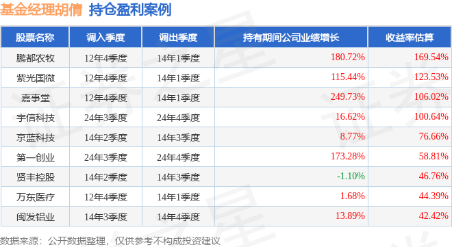 胡倩管理的长信量化先锋混合A基金在12年4季度买入鹏都农牧,在持有1年又1个季度后在14年1季度卖出。持有期间的估算收益率为169.54%,持有期间鹏都农牧在2012年到2014年的年报归属净利润增幅达180.72%。