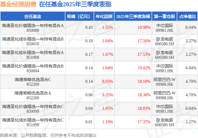证券之星消息,截止2025年三季度末,基金经理胡倩旗下共管理8只基金,本季度表现最佳的为海通量化价值精选一年持有混合B(850004),季度净值涨19.02%。