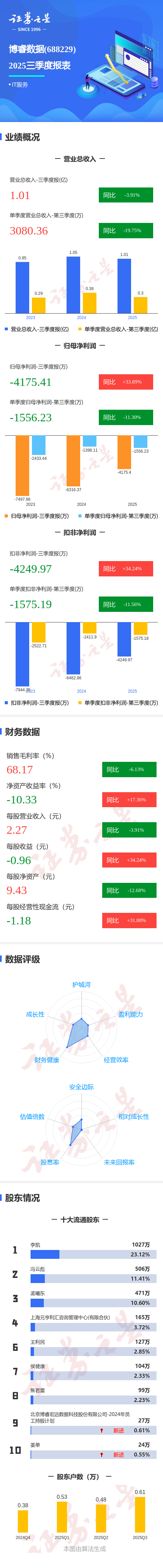 证券之星消息,博睿数据2025年三季报显示,公司主营收入1.01亿元,同比下降3.92%;归母净利润-4175.41万元,同比上升33.9%;扣非净利润-4249.97万元,同比上升34.24%;其中2025年第三季度,公司单季度主营收入3080.36万元,同比下降19.75%;单季度归母净利润-1556.23万元,同比下降11.31%;单季度扣非净利润-1575.19万元,同比下降11.56%;负债率12.38%,投资收益29.63万元,财务费用-379.66万元,毛利率68.17%。