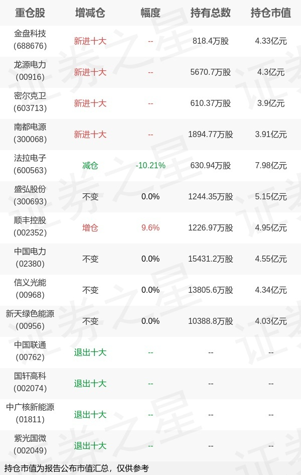 证券之星消息,10月28日前海开源基金旗下崔宸龙管理的前海开源公用事业行业股票型基金公布三季报,近1年净值增长率31.21%。与上一季度相比,该基金前十大重仓股新增金盘科技,龙源电力,密尔克卫,南都电源;其中法拉电子持仓占比8.38%,为该基金第一大重仓股;中国联通,国轩高科,中广核新能源,紫光国微等退出前十大重仓股;详细数据如下: