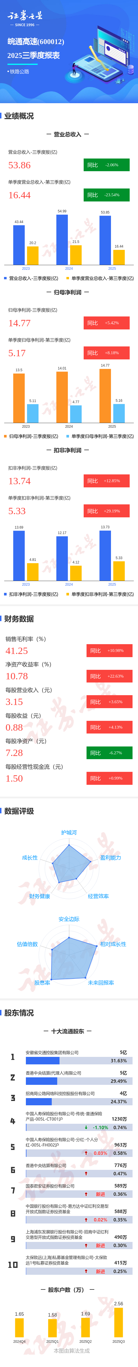 证券之星消息,皖通高速2025年三季报显示,公司主营收入53.86亿元,同比下降2.07%;归母净利润14.77亿元,同比上升5.43%;扣非净利润13.74亿元,同比上升12.85%;其中2025年第三季度,公司单季度主营收入16.44亿元,同比下降23.54%;单季度归母净利润5.17亿元,同比上升8.19%;单季度扣非净利润5.33亿元,同比上升29.19%;负债率52.22%,投资收益5915.5万元,财务费用1.59亿元,毛利率41.25%。