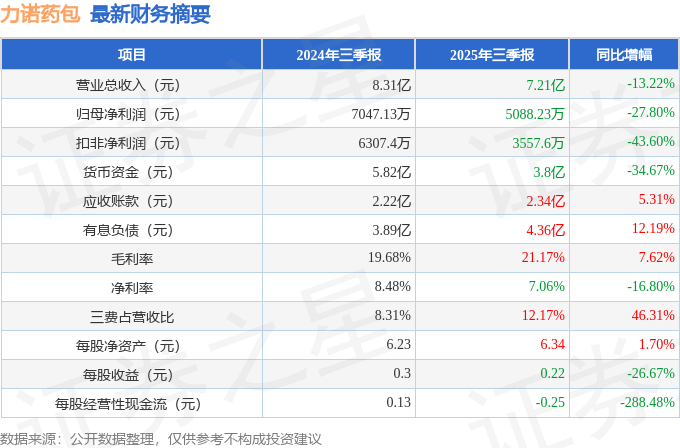 据证券之星公开数据整理,近期力诺药包(301188)发布2025年三季报。截至本报告期末,公司营业总收入7.21亿元,同比下降13.22%,归母净利润5088.23万元,同比下降27.8%。按单季度数据看,第三季度营业总收入2.22亿元,同比下降17.69%,第三季度归母净利润991.49万元,同比下降48.32%。本报告期力诺药包三费占比上升明显,财务费用、销售费用和管理费用总和占总营收同比增幅达46.31%。