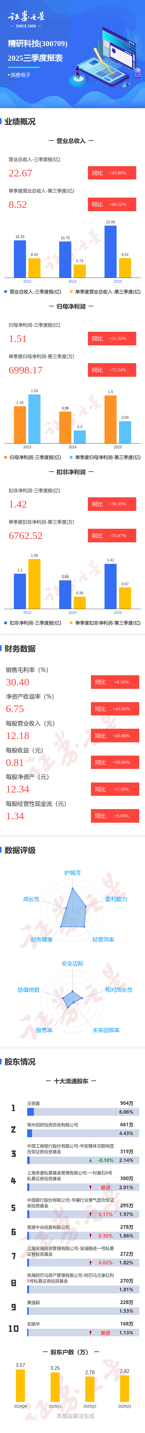 证券之星消息,精研科技2025年三季报显示,前三季度公司主营收入22.67亿元,同比上升43.86%;归母净利润1.51亿元,同比上升51.33%;扣非净利润1.42亿元,同比上升58.36%;其中2025年第三季度,公司单季度主营收入8.52亿元,同比上升48.53%;单季度归母净利润6998.17万元,同比上升73.25%;单季度扣非净利润6762.52万元,同比上升75.98%;负债率44.16%,投资收益20.7万元,财务费用188.24万元,毛利率30.4%。