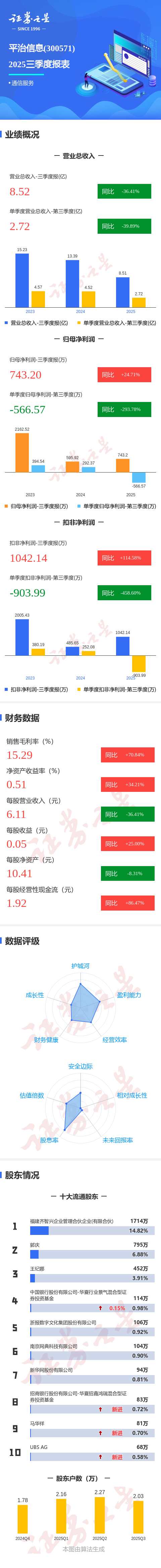 证券之星消息,平治信息2025年三季报显示,前三季度公司主营收入8.52亿元,同比下降36.41%;归母净利润743.2万元,同比上升24.71%;扣非净利润1042.14万元,同比上升114.59%;其中2025年第三季度,公司单季度主营收入2.72亿元,同比下降39.89%;单季度归母净利润-566.57万元,同比下降293.79%;单季度扣非净利润-903.99万元,同比下降458.6%;负债率68.13%,投资收益-116.57万元,财务费用5419.77万元,毛利率15.29%。