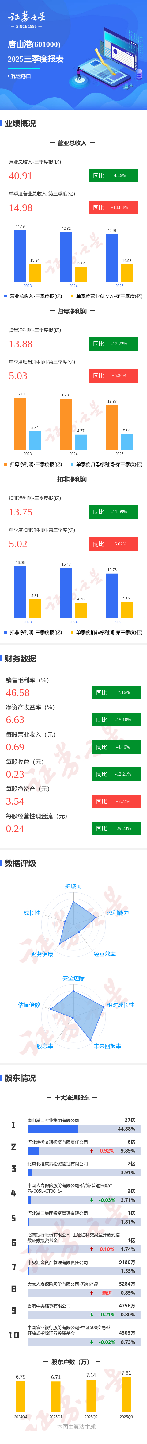 证券之星消息,唐山港2025年三季报显示,前三季度公司主营收入40.91亿元,同比下降4.47%;归母净利润13.88亿元,同比下降12.22%;扣非净利润13.75亿元,同比下降11.1%;其中2025年第三季度,公司单季度主营收入14.98亿元,同比上升14.84%;单季度归母净利润5.03亿元,同比上升5.37%;单季度扣非净利润5.02亿元,同比上升6.02%;负债率9.45%,投资收益3.32亿元,财务费用-1.12亿元,毛利率46.58%。