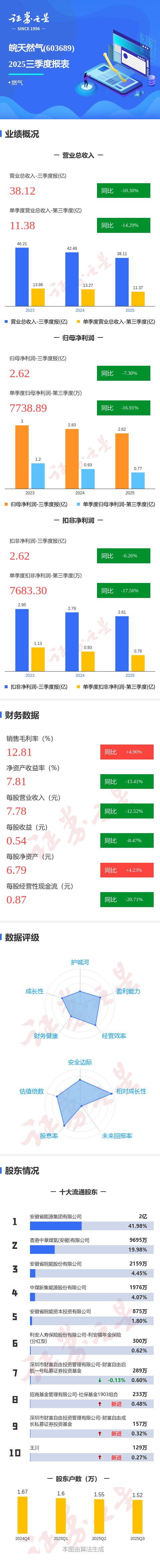 证券之星消息,皖天然气2025年三季报显示,前三季度公司主营收入38.12亿元,同比下降10.3%;归母净利润2.62亿元,同比下降7.31%;扣非净利润2.62亿元,同比下降6.27%;其中2025年第三季度,公司单季度主营收入11.38亿元,同比下降14.3%;单季度归母净利润7738.89万元,同比下降16.91%;单季度扣非净利润7683.3万元,同比下降17.56%;负债率47.71%,投资收益4569.49万元,财务费用4147.02万元,毛利率12.81%。
