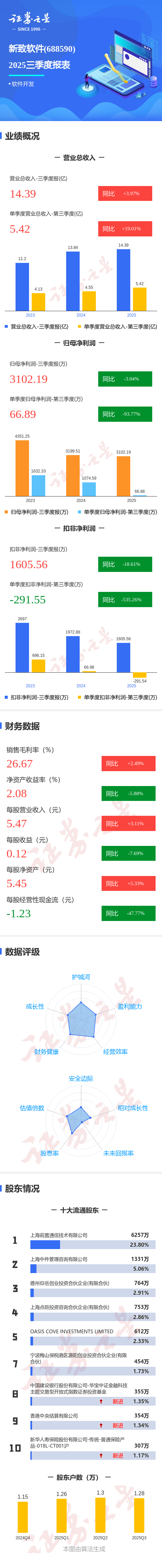 证券之星消息,新致软件2025年三季报显示,前三季度公司主营收入14.39亿元,同比上升3.97%;归母净利润3102.19万元,同比下降3.04%;扣非净利润1605.56万元,同比下降18.62%;其中2025年第三季度,公司单季度主营收入5.42亿元,同比上升19.01%;单季度归母净利润66.89万元,同比下降93.78%;单季度扣非净利润-291.55万元,同比下降535.26%;负债率53.13%,投资收益580.3万元,财务费用3605.92万元,毛利率26.67%。