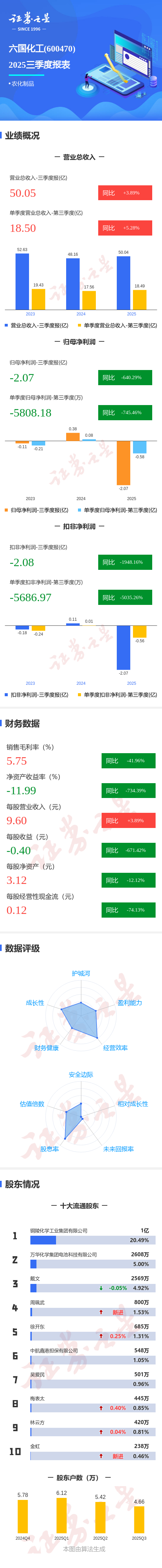 证券之星消息,六国化工2025年三季报显示,前三季度公司主营收入50.05亿元,同比上升3.9%;归母净利润-2.07亿元,同比下降640.3%;扣非净利润-2.08亿元,同比下降1948.17%;其中2025年第三季度,公司单季度主营收入18.5亿元,同比上升5.29%;单季度归母净利润-5808.18万元,同比下降745.46%;单季度扣非净利润-5686.97万元,同比下降5035.27%;负债率71.46%,投资收益165.82万元,财务费用2940.88万元,毛利率5.75%。