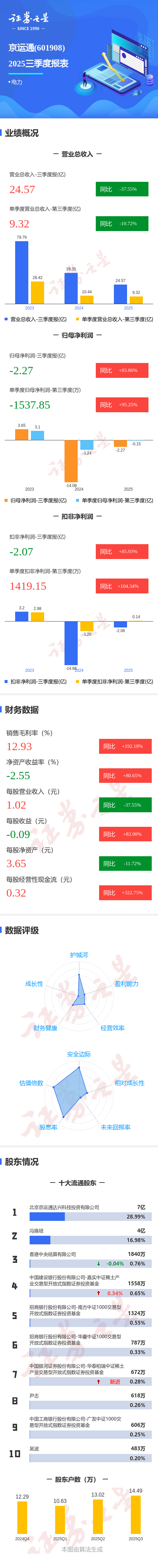 证券之星消息,京运通2025年三季报显示,前三季度公司主营收入24.57亿元,同比下降37.55%;归母净利润-2.27亿元,同比上升83.86%;扣非净利润-2.07亿元,同比上升85.93%;其中2025年第三季度,公司单季度主营收入9.32亿元,同比下降10.72%;单季度归母净利润-1537.85万元,同比上升95.26%;单季度扣非净利润1419.15万元,同比上升104.34%;负债率52.93%,投资收益-9819.15万元,财务费用2.17亿元,毛利率12.93%。