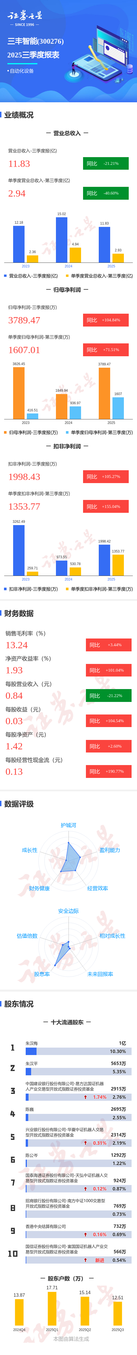 证券之星消息,三丰智能2025年三季报显示,前三季度公司主营收入11.83亿元,同比下降21.22%;归母净利润3789.47万元,同比上升104.84%;扣非净利润1998.43万元,同比上升105.27%;其中2025年第三季度,公司单季度主营收入2.94亿元,同比下降40.6%;单季度归母净利润1607.01万元,同比上升71.51%;单季度扣非净利润1353.77万元,同比上升155.05%;负债率53.29%,投资收益1399.35万元,财务费用-85.62万元,毛利率13.24%。