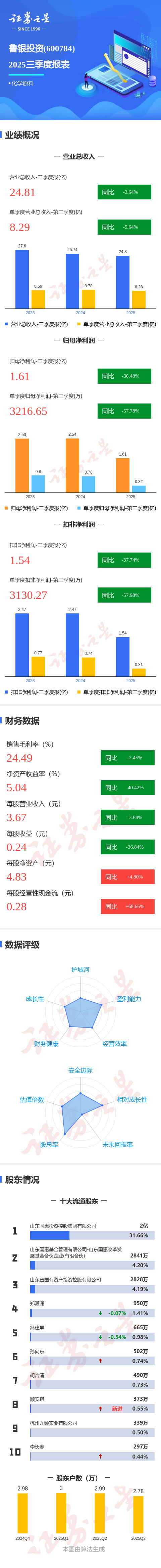 证券之星消息,鲁银投资2025年三季报显示,前三季度公司主营收入24.81亿元,同比下降3.65%;归母净利润1.61亿元,同比下降36.48%;扣非净利润1.54亿元,同比下降37.75%;其中2025年第三季度,公司单季度主营收入8.29亿元,同比下降5.64%;单季度归母净利润3216.65万元,同比下降57.79%;单季度扣非净利润3130.27万元,同比下降57.99%;负债率40.77%,投资收益3797.62万元,财务费用2862.89万元,毛利率24.49%。