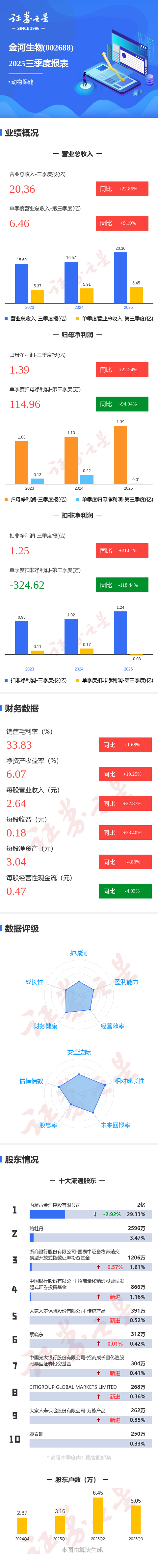 证券之星消息,金河生物2025年三季报显示,前三季度公司主营收入20.36亿元,同比上升22.86%;归母净利润1.39亿元,同比上升22.25%;扣非净利润1.25亿元,同比上升21.82%;其中2025年第三季度,公司单季度主营收入6.46亿元,同比上升9.2%;单季度归母净利润114.96万元,同比下降94.94%;单季度扣非净利润-324.62万元,同比下降118.45%;负债率53.45%,投资收益-113.91万元,财务费用6747.56万元,毛利率33.83%。