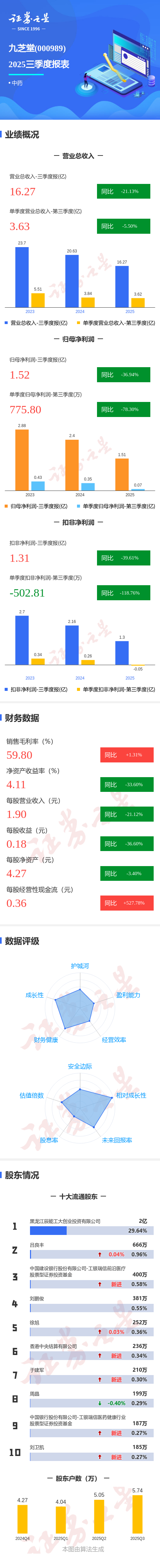 证券之星消息,九芝堂2025年三季报显示,前三季度公司主营收入16.27亿元,同比下降21.13%;归母净利润1.52亿元,同比下降36.94%;扣非净利润1.31亿元,同比下降39.62%;其中2025年第三季度,公司单季度主营收入3.63亿元,同比下降5.51%;单季度归母净利润775.8万元,同比下降78.3%;单季度扣非净利润-502.81万元,同比下降118.77%;负债率22.77%,投资收益2001.09万元,财务费用-188.1万元,毛利率59.8%。