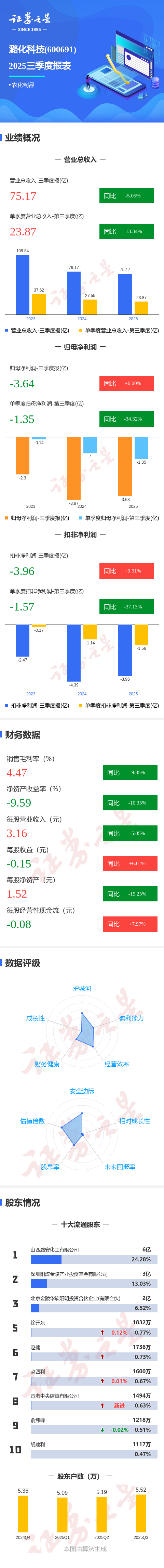 证券之星消息,潞化科技2025年三季报显示,前三季度公司主营收入75.17亿元,同比下降5.06%;归母净利润-3.64亿元,同比上升6.01%;扣非净利润-3.96亿元,同比上升9.91%;其中2025年第三季度,公司单季度主营收入23.87亿元,同比下降13.35%;单季度归母净利润-1.35亿元,同比下降34.33%;单季度扣非净利润-1.57亿元,同比下降37.14%;负债率76.25%,投资收益1171.04万元,财务费用1.69亿元,毛利率4.47%。