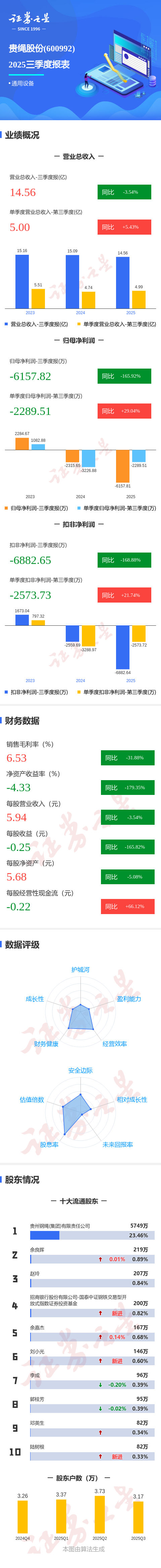 证券之星消息,贵绳股份2025年三季报显示,前三季度公司主营收入14.56亿元,同比下降3.54%;归母净利润-6157.82万元,同比下降165.92%;扣非净利润-6882.65万元,同比下降168.89%;其中2025年第三季度,公司单季度主营收入5.0亿元,同比上升5.43%;单季度归母净利润-2289.51万元,同比上升29.05%;单季度扣非净利润-2573.73万元,同比上升21.75%;负债率59.28%,投资收益17.22万元,财务费用969.51万元,毛利率6.53%。