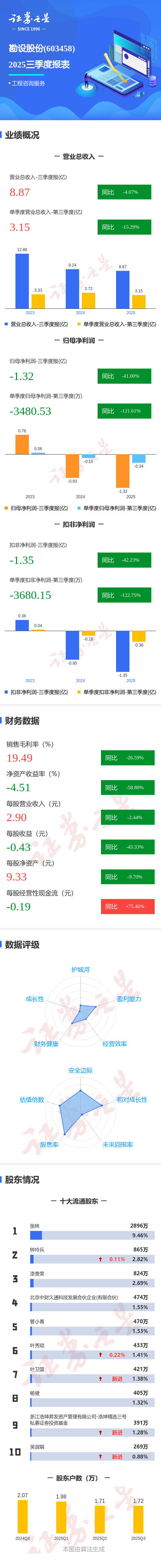 证券之星消息,勘设股份2025年三季报显示,前三季度公司主营收入8.87亿元,同比下降4.07%;归母净利润-1.32亿元,同比下降41.01%;扣非净利润-1.35亿元,同比下降42.23%;其中2025年第三季度,公司单季度主营收入3.15亿元,同比下降15.3%;单季度归母净利润-3480.53万元,同比下降121.62%;单季度扣非净利润-3680.15万元,同比下降122.75%;负债率48.16%,投资收益823.35万元,财务费用2842.12万元,毛利率19.49%。