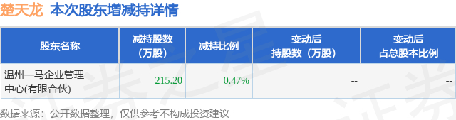 证券之星消息,10月30日楚天龙发布公告《楚天龙:关于股东减持股份触及1%整数倍的公告》,其股东温州一马企业管理中心(有限合伙)于2025年10月14日至2025年10月29日间合计减持215.2万股,占公司目前总股本的0.4667%,变动期间该股股价上涨6.85%,截止10月29日收盘报21.69元。