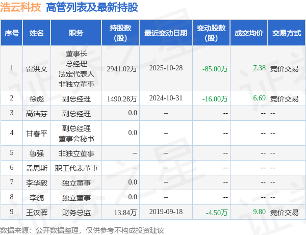 浩云科技近半年内的董监高及核心技术人员增减持详情如下: