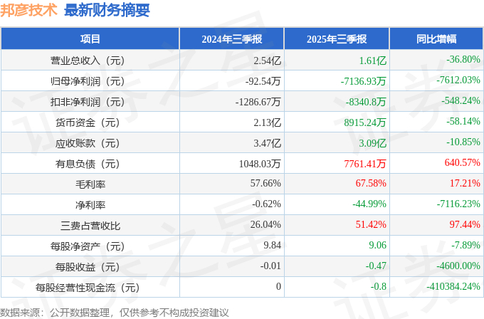 据证券之星公开数据整理,近期邦彦技术(688132)发布2025年三季报。截至本报告期末,公司营业总收入1.61亿元,同比下降36.8%,归母净利润-7136.93万元,同比下降7612.03%。按单季度数据看,第三季度营业总收入9116.26万元,同比上升145.94%,第三季度归母净利润-1169.54万元,同比上升70.27%。本报告期邦彦技术三费占比上升明显,财务费用、销售费用和管理费用总和占总营收同比增幅达73.34%。