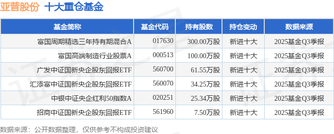 持有亚普股份最多的基金为富国周期精选三年持有期混合A,目前规模为15.08亿元,最新净值1.1503(10月31日),较上一交易日上涨0.38%,近一年上涨26.95%。该基金现任基金经理为孙彬。