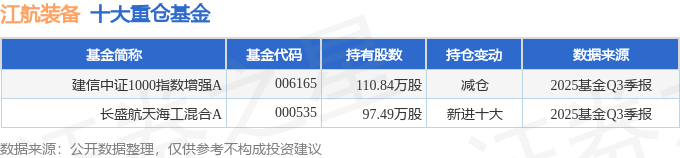 持有江航装备最多的基金为建信中证1000指数增强A,目前规模为7.4亿元,最新净值2.0129(10月30日),较上一交易日下跌1.53%,近一年上涨38.47%。该基金现任基金经理为叶乐天 赵云煜。
