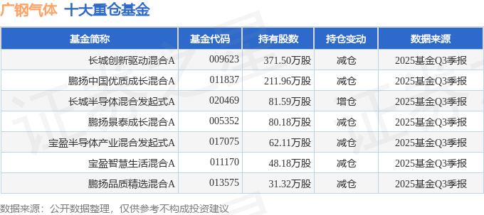 持有广钢气体最多的基金为长城创新驱动混合A,目前规模为7.13亿元,最新净值1.0055(10月31日),较上一交易日下跌0.07%,近一年上涨32.25%。该基金现任基金经理为杨维维。