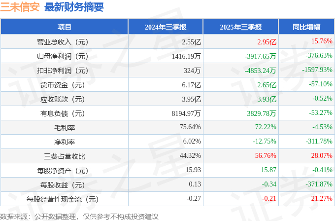 据证券之星公开数据整理,近期三未信安(688489)发布2025年三季报。截至本报告期末,公司营业总收入2.95亿元,同比上升15.76%,归母净利润-3917.65万元,同比下降376.63%。按单季度数据看,第三季度营业总收入9976.34万元,同比上升16.91%,第三季度归母净利润-979.07万元,同比下降2263.27%。本报告期三未信安公司应收账款体量较大,当期应收账款占最新年报归母净利润比达931.89%。
