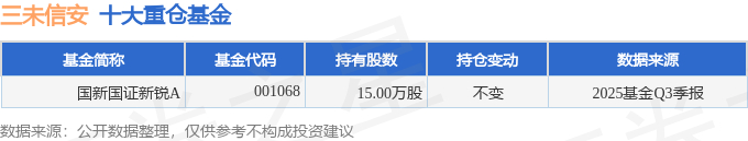 持有三未信安最多的基金为国新国证新锐A,目前规模为1.17亿元,最新净值1.731(10月31日),较上一交易日上涨5.04%,近一年上涨40.85%。该基金现任基金经理为张洪磊。