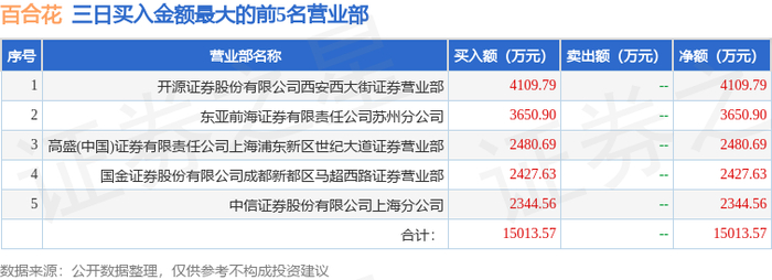 证券之星消息,沪深交易所2025年11月3日公布的交易公开信息显示,百合花(603823)因非ST、*ST和S证券连续三个交易日内收盘价格涨幅偏离值累计达到20%的证券登上龙虎榜。此次是近5个交易日内第2次上榜。