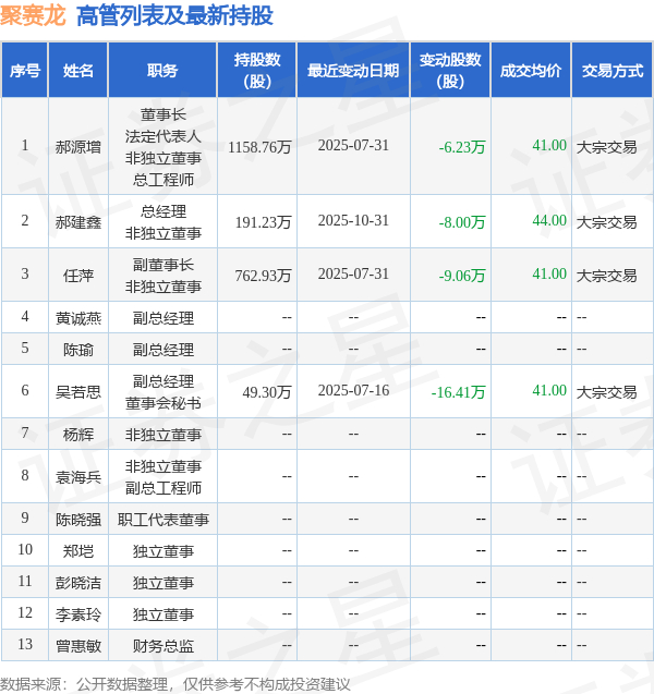 聚赛龙近半年内的董监高及核心技术人员增减持详情如下: