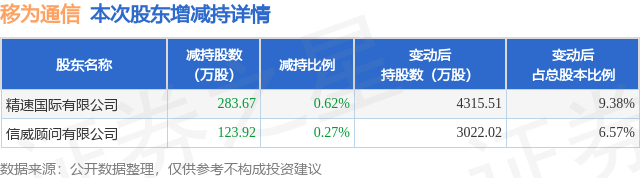 证券之星消息,11月7日移为通信发布公告《移为通信:关于公司持股5%以上股东及部分高级管理人员减持计划提前终止的公告》,其股东精速国际有限公司、信威顾问有限公司于2025年9月13日至2025年11月7日间合计减持407.59万股,占公司目前总股本的0.8863%,变动期间该股股价下跌8.1%,截止11月7日收盘报12.14元。