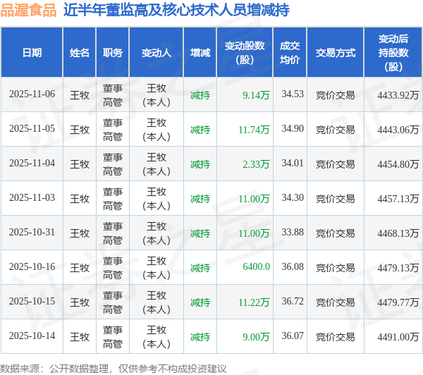 证券之星消息,根据11月7日市场公开信息、上市公司公告及交易所披露数据整理,品渥食品(300892)最新董监高及相关人员股份变动情况:2025年11月6日公司董事,高管王牧共减持公司股份9.14万股,占公司总股本为0.0914%。变动期间公司股价下跌1.52%,11月6日当日收盘报34.39元。