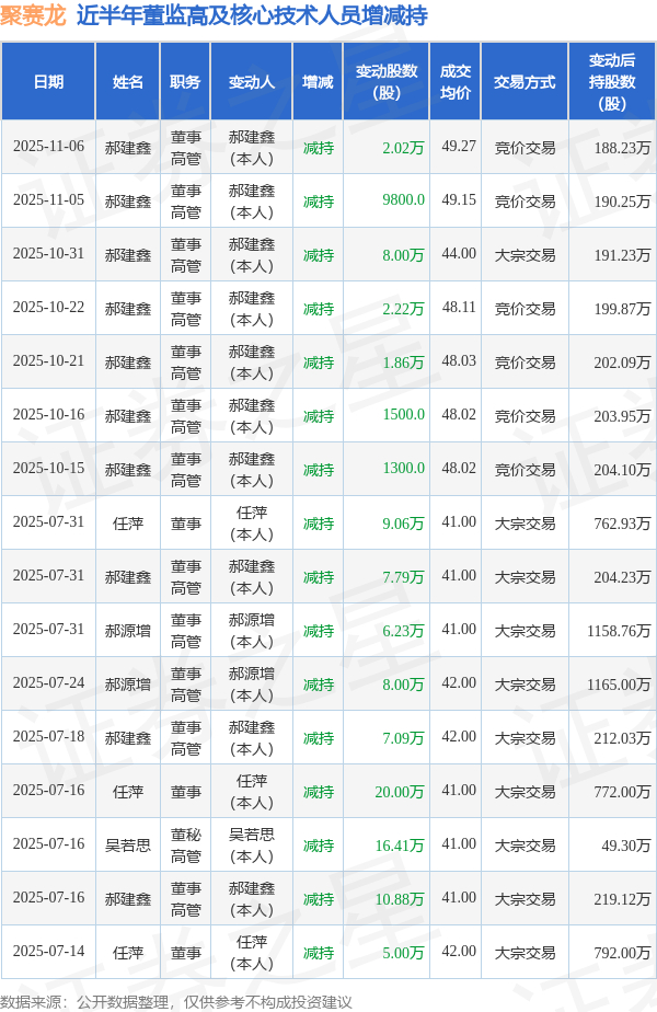 聚赛龙近半年内的董监高及核心技术人员增减持详情如下: