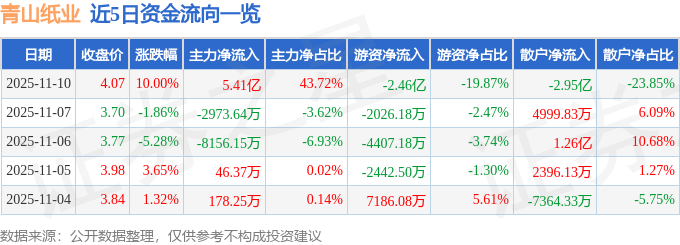 11月10日的资金流向数据方面,主力资金净流入5.41亿元,占总成交额43.72%,游资资金净流出2.46亿元,占总成交额19.87%,散户资金净流出2.95亿元,占总成交额23.85%。