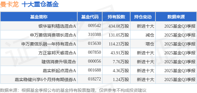 根据2025基金Q3季报公募基金重仓股数据,重仓该股的公募基金共7家,其中持有数量最多的公募基金为银华基金的银华富利精选混合A。银华富利精选混合A目前规模为17.23亿元,最新净值0.6113(11月7日),较上一交易日下跌2.38%,近一年上涨6.54%。该公募基金现任基金经理为焦巍 秦锋。焦巍在任的基金产品包括:银华富裕主题混合A,管理时间为2018年12月27日至今,期间收益率为103.6%;银华富饶精选三年持有期混合,管理时间为2021年5月28日至今,期间收益率为-38.25%;银华富久食品饮料精选混合(LOF)A,管理时间为2021年9月3日至今,期间收益率为-42.63%。秦锋在任的基金产品包括:银华中证全指医药卫生,管理时间为2017年9月28日至今,期间收益率为34.95%;