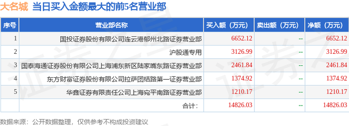 证券之星消息,沪深交易所2025年11月11日公布的交易公开信息显示,大名城(600094)因有价格涨跌幅限制的日收盘价格涨幅偏离值达到7%的前五只证券登上龙虎榜。此次是近5个交易日内第1次上榜。