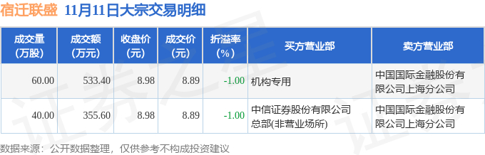 证券之星消息,11月11日宿迁联盛发生大宗交易,交易数据如下: