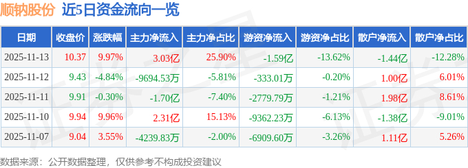 证券之星消息,顺钠股份11月13日涨停收盘,收盘价10.37元。该股于9点56分涨停,未打开涨停,截止收盘封单资金为1.11亿元,占其流通市值1.56%。