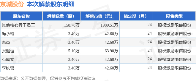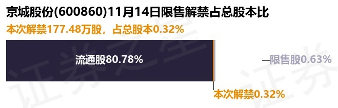 证券之星消息,根据市场公开信息整理,京城股份(600860)于11月14日将有177.48万股限售股份解禁,为公司股权激励限售股份,占公司总股本0.32%。(本次数据根据历史公告整理得出,实际情况以上市公司最新公告为准)最近一年内,该股累计解禁703.46万股,占总股本的1.28%。本次解禁后,公司还有344.52万股限售股份,占总股本0.63%。具体如下图所示: