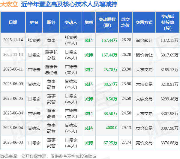 大宏立近半年内的董监高及核心技术人员增减持详情如下: