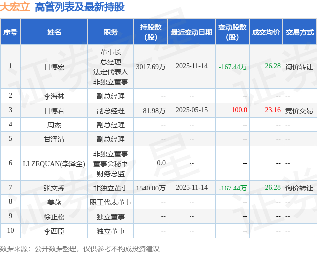 大宏立的高管列表及最新持股情况如下:
