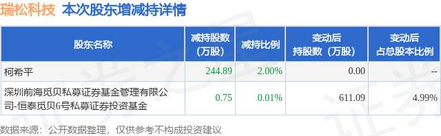 证券之星消息,11月14日瑞松科技发布公告《瑞松科技:关于股东减持股份结果公告》,其股东深圳前海觅贝私募证券基金管理有限公司-恒泰觅贝6号私募证券投资基金、柯希平于2025年8月21日至2025年11月14日间合计减持245.65万股,占公司目前总股本的2.0075%,变动期间该股股价上涨10.01%,截止11月14日收盘报39.78元。