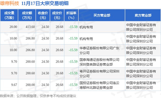 证券之星消息,11月17日雄帝科技发生大宗交易,交易数据如下: